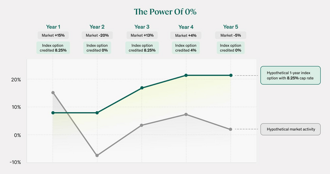 If an index is down, the index option to which it's tracked will never go below 0%—meaning you’ll avoid all market-based losses.
